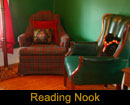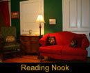 Hunter’s Retreat is hunter green in color with lavish designer bed linens. Large, original 19th century family hunt scenes grace the walls. Furnishings include a sofa, rare mission oak clergy desk, Martha Washington chair, an ornate wooden Eastlake (with galvanized interior lining) shaving stand, and an oak dresser. Framed needlepoint samplers dated 1900, share a gallery with American folk art in an intimate reading area for two. The Inn’s lush rear grounds and side gardens can be viewed.