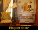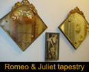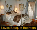 Luxury suite, perfect for a romantic getaway! Located off the front portico, décor is old world, with a silver, gold, ecru and bronze palette. Period architectural pieces are found in unexpected places. A collection of shapely American potteries line a mirrored fireplace mantel. Romantic period artwork such as a French silk Romeo and Juliet tapestry, and an early print of the interior of Shakespeare’s birthplace (a find discovered by the innkeepers after purchasing an appealing frame, and removing several layers of prints added through the years by a previous owner).