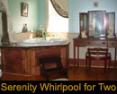 Bath Amenities: * Jetteed tub for two * A double sink & mirrored vanity * An additional three-way mirrored make-up vanity & vanity bench *Hairdryer * Full length mirror * All natural ingredient Inn personalized toiletries: (4) Soaps: Rosemary & Thyme glycerin, Lavender, and Unscented oatmeal Bath gel * Herb bath grains * Shampoo * Conditioner * Shower cap * Sewing kit * Nail board * Cotton ball * Q-tip * Cosmetic pad & make-up remover towelette * Night light *